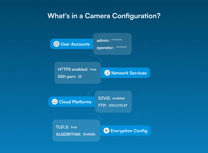 Track firmware versions (NDAA Section 889), monitor encryption settings (PCI DSS), detect unauthorized access (GDPR), maintain audit trails for regulatory requirements.
