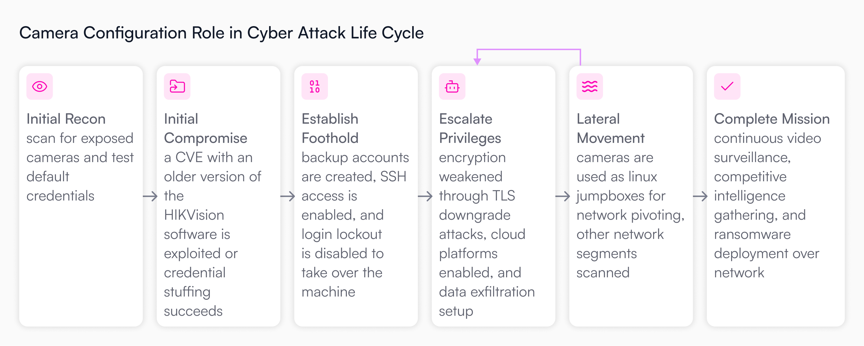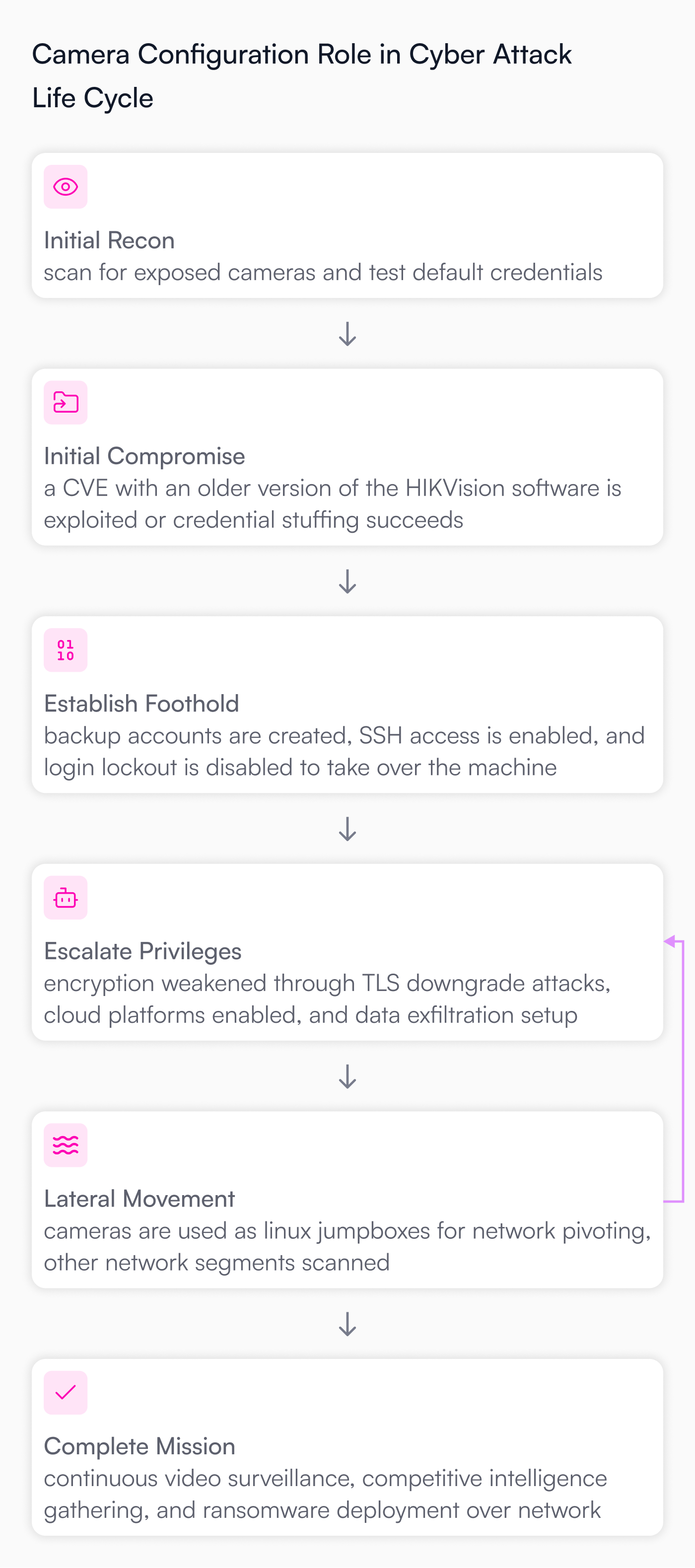 Cameras often bridge isolated networks. Attackers enable port forwarding, modify network interfaces to bridge segments, enable SSH access, disable IP filtering, and turn off login lockout policies. The camera then becomes a risk to the rest of your environment, allowing for lateral movement and continued privilege escalation.