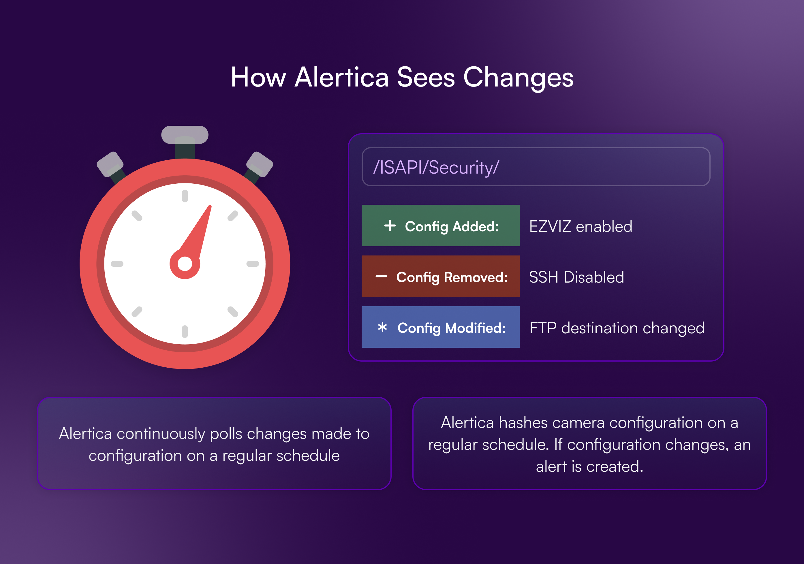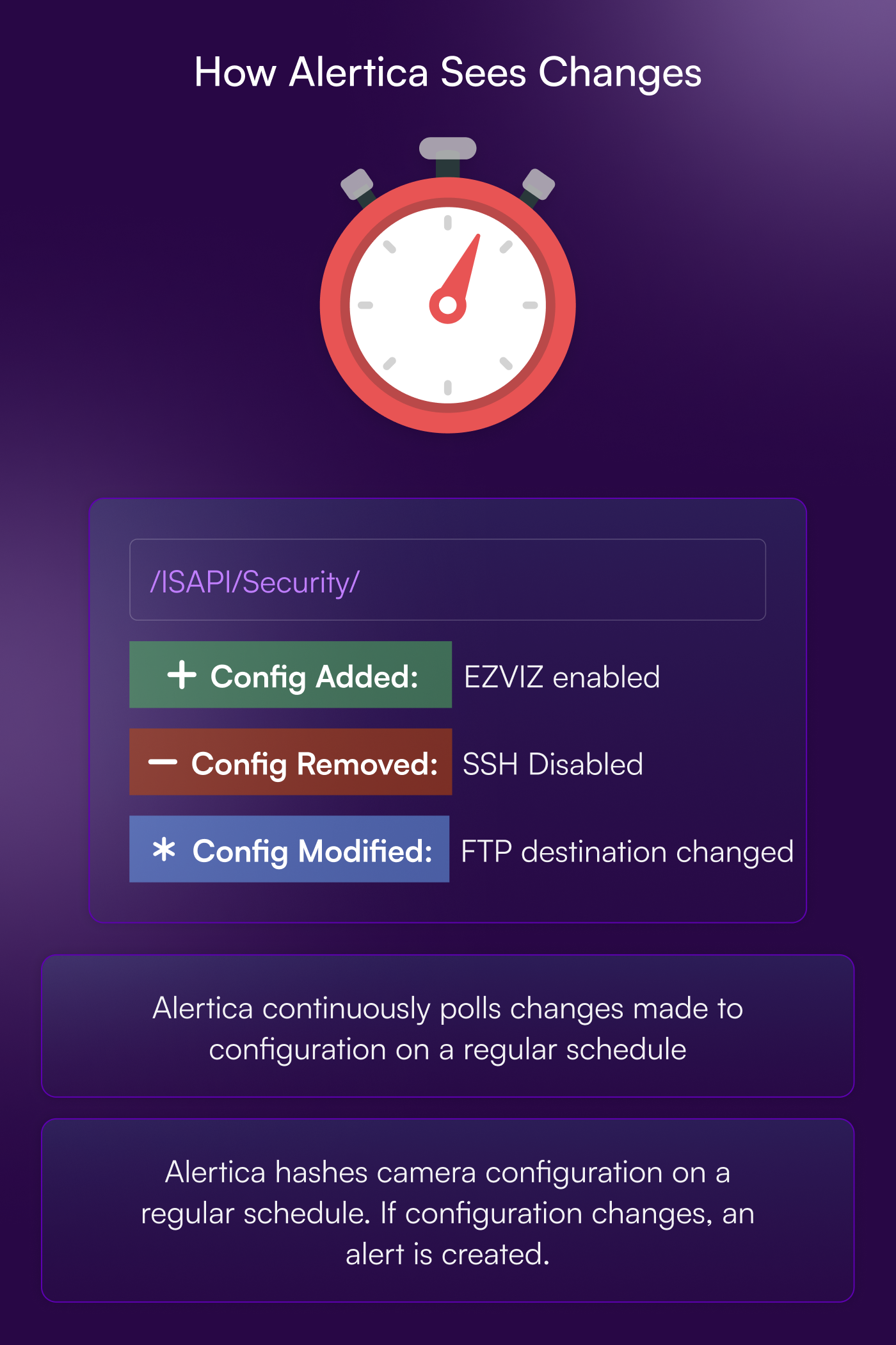 By monitoring configuration structure through ISAPI, Alertica helps teams detect tampering faster and respond sooner. This makes Alertica especially valuable for environments that are difficult to monitor with traditional tools: legacy systems, distributed deployments, or cameras that struggle to run heavyweight security agents.