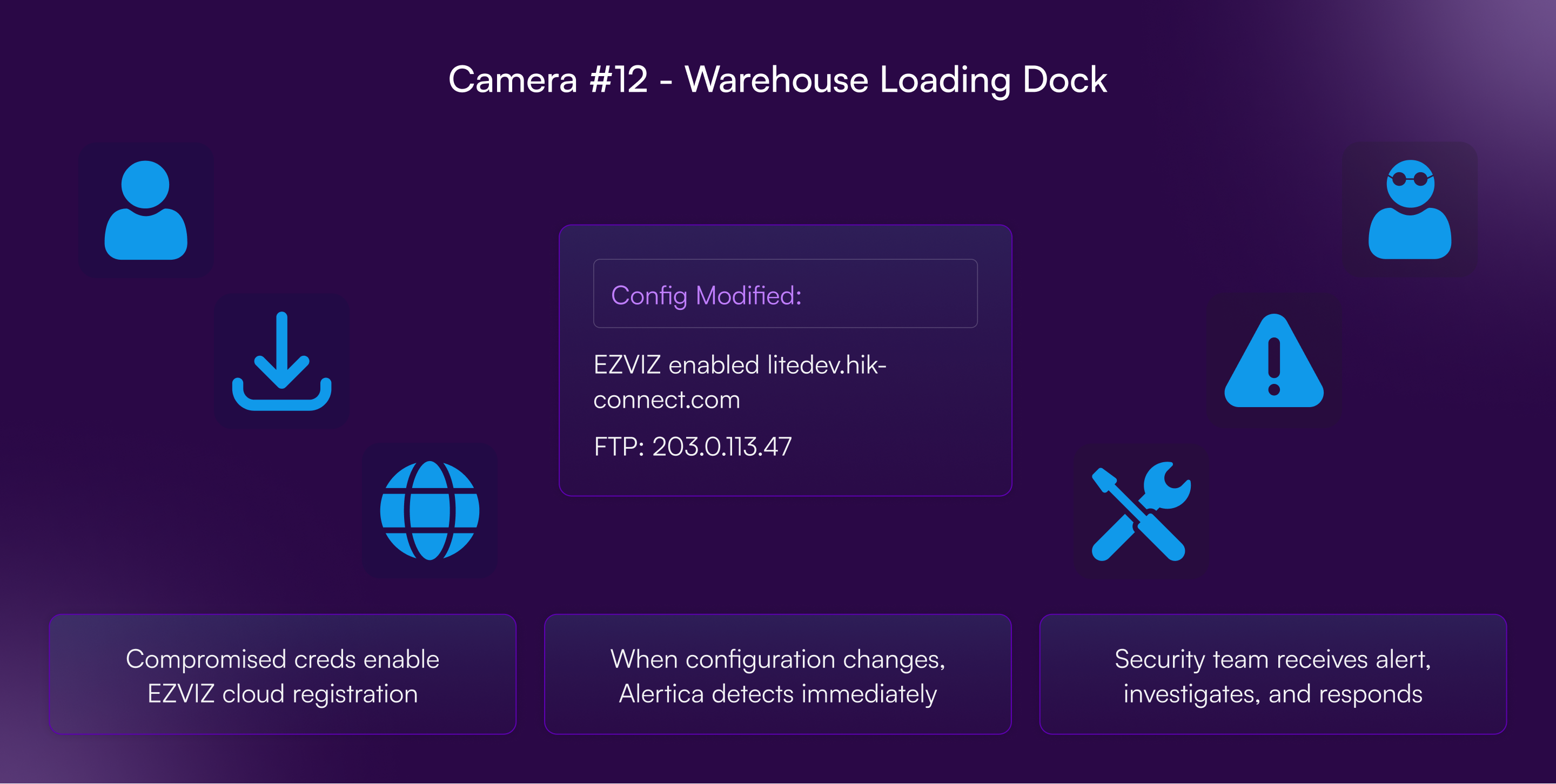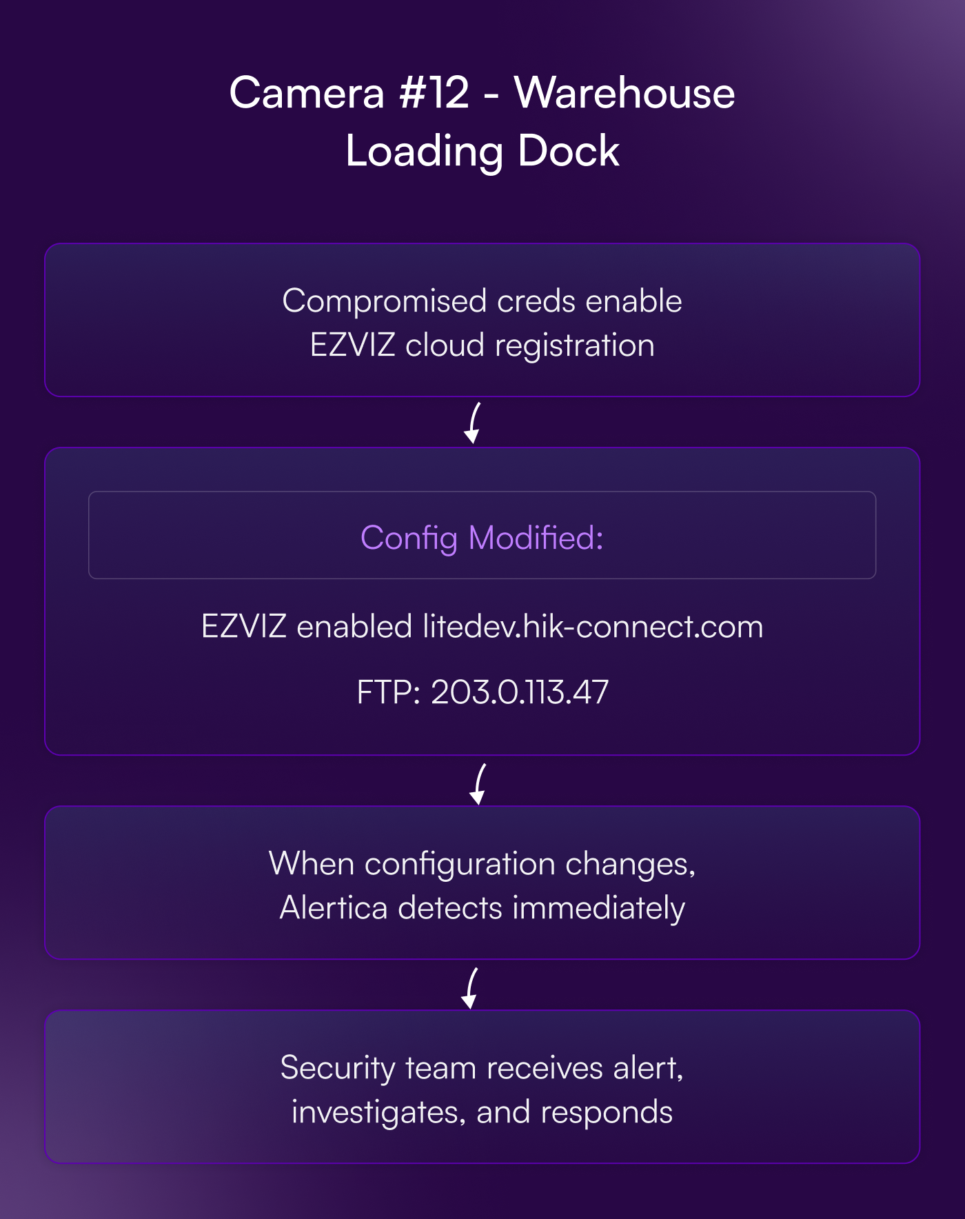 Without Alertica, the change could have gone unnoticed for weeks. Imagine camera streams to an unauthorized cloud account and uploads to an attacker's FTP server. The breach is discovered only when a competitor makes suspiciously well-timed moves. Months of operational intelligence gone, with no idea when compromise began or what was accessed. Incident response could cost tens of thousands, and the competitive damage is immeasurable. And the root cause was all a simple late night configuration change - invisible to every other security tool.