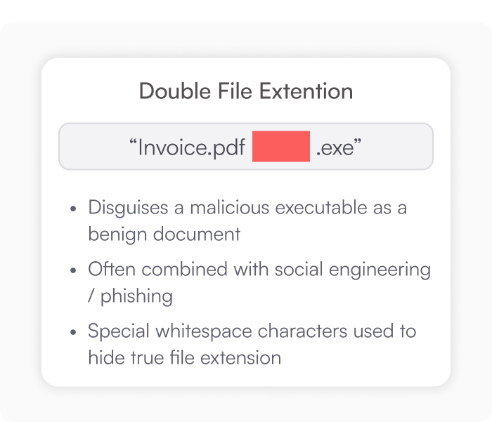 Another strategy attackers use is a double file extension. This is commonly used by threat actors alongside social engineering to coerce users to double click an executable disguised as a document or other piece of media. Locating these files as they make it onto a filesystem can provide a valuable starting point for incident response - giving opportunity to stop these attacks before they even begin.