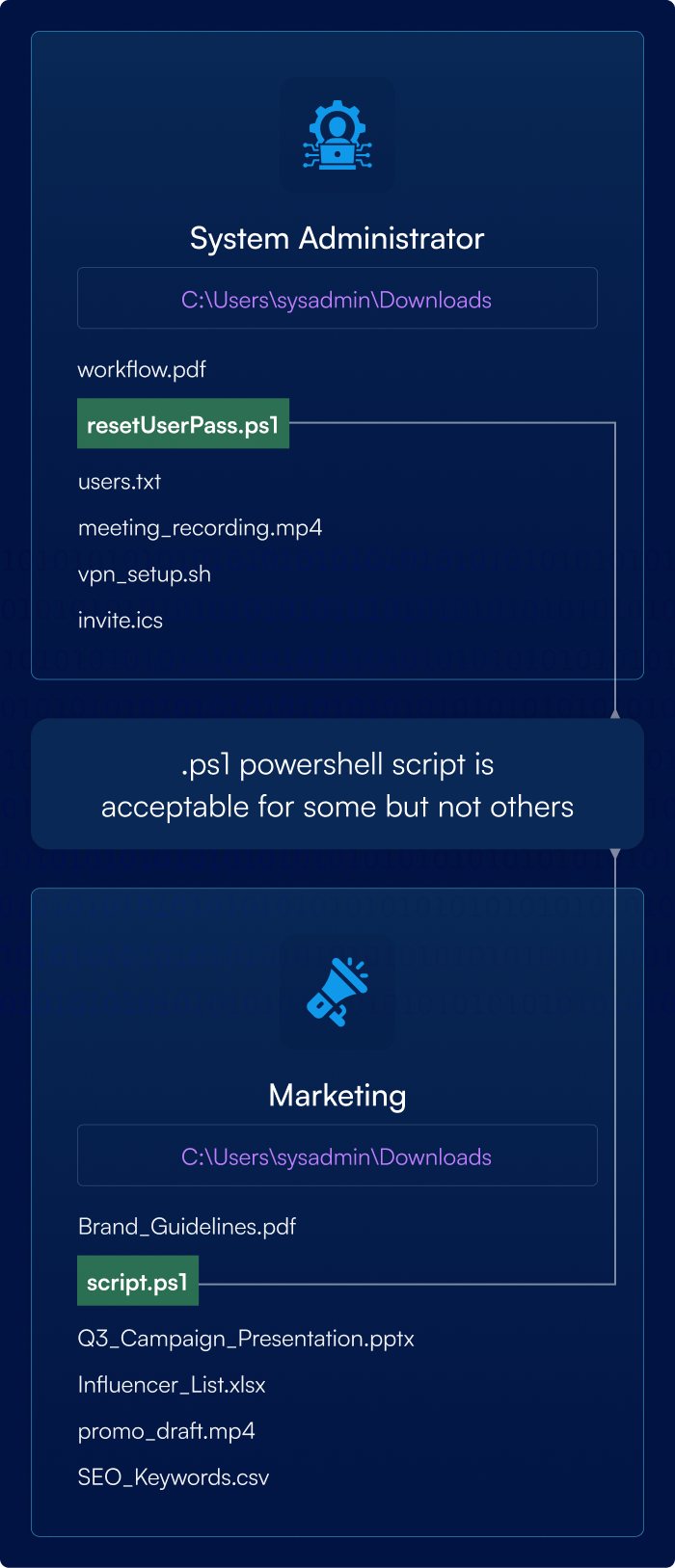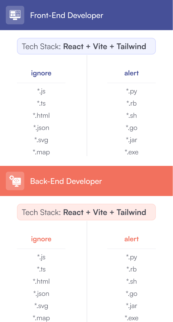 Alertica can be used for user and role based alerting, allowing for customized monitoring tailored for each department's software stack. Consider a front-end and back-end developer: while the technologies these users employ work closely with each other, distinct file signatures can often be expected in their working directories and identifying deviations from this can assist with environment cleanup and spark conversation on software development procedure.